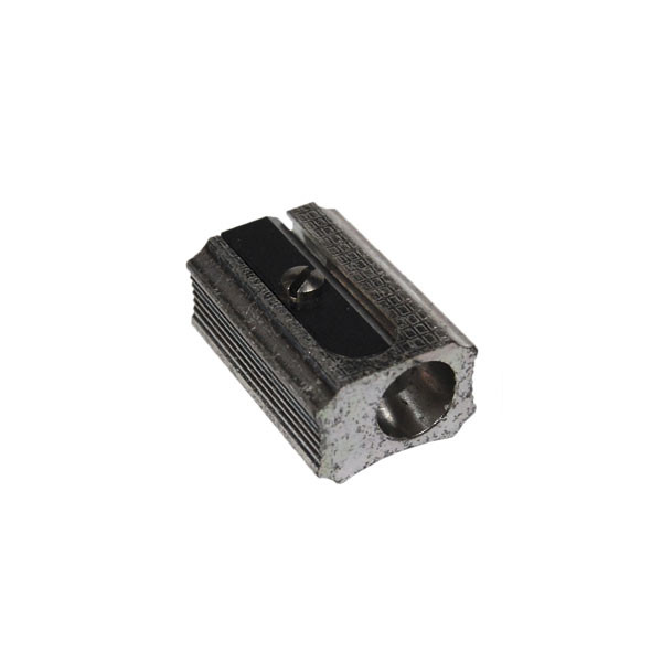 Single block shaped light metal sharpener for left handed users. With 1 spare blade.